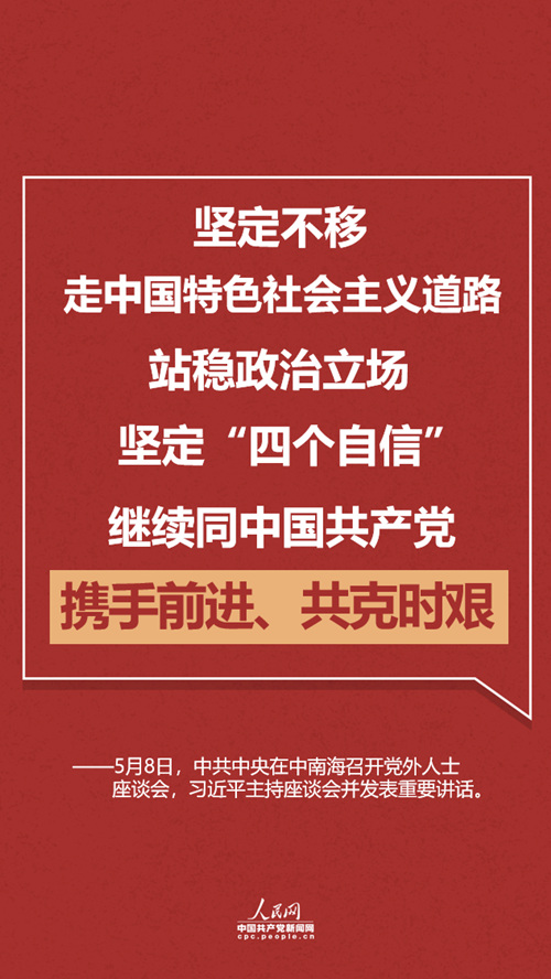 一是堅(jiān)定不移走中國特色社會(huì)主義道路,站穩(wěn)政治立場(chǎng),堅(jiān)定“四個(gè)自信”,繼續(xù)同中國共產(chǎn)黨攜手前進(jìn)、共克時(shí)艱。
