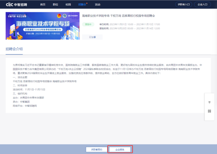 在企業(yè)后臺進入“招聘會”模塊,選擇本次招聘會,點擊“報名參會”后進行“添加職位”完成報名