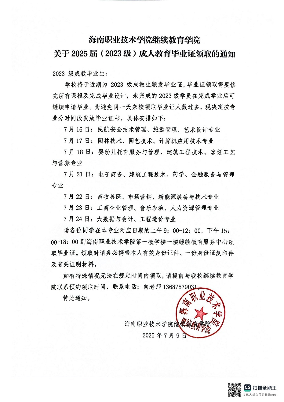 關(guān)于2025屆(2023級)成人教育畢業(yè)證領(lǐng)取的通知