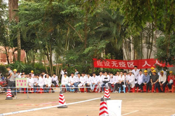 大會由我校生物工程學院鄭繼昌教授、??谑修r業(yè)局獸醫(yī)處姜秀莉處長等任技術指導。??谑修r業(yè)局黨組書記局長張志堅、??谑行竽莲F醫(yī)局局長顧貧、瓊山區(qū)副區(qū)長王敏、海南職業(yè)技術學院生物工程學院副院長李軍等領導到演練現(xiàn)場指導。我校生物工程學院150名師生到場觀摩演練,并進行現(xiàn)場記錄及學習。
