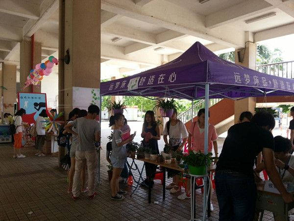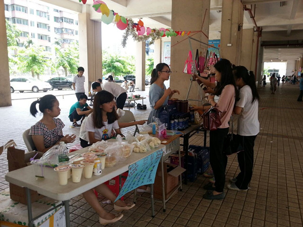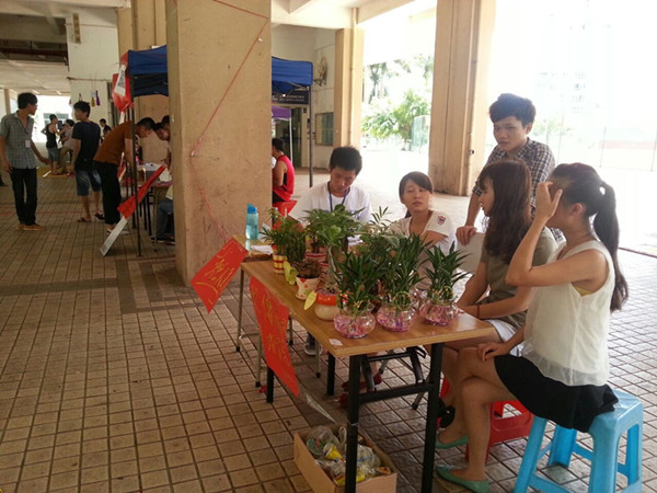 參賽的同學(xué)站在各自臨時(shí)搭起的攤位前,使出各種招數(shù)招攬客人,展示自己的口才,熱情地向前來(lái)的同學(xué)介紹自己的商品,比賽競(jìng)爭(zhēng)激烈,現(xiàn)場(chǎng)氛圍異?;馃?。有免費(fèi)試吃吸引大批吃貨的,有團(tuán)購(gòu)享折扣刺激消費(fèi)的,還有微信推廣宣傳的,更有一家小鋪打出攜手為韓艾佳獻(xiàn)上一份愛(ài)心的標(biāo)語(yǔ),讓不少同學(xué)紛紛解囊。筆者在采訪時(shí),就自行選購(gòu)了各式零食和冷飲,讓這張嘴也體驗(yàn)體驗(yàn);而不少路過(guò)的老師,則更多的是選購(gòu)發(fā)財(cái)樹(shù)、富貴竹之類(lèi)的花卉來(lái)裝點(diǎn)辦公室。