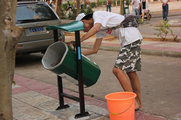 正在擦洗垃圾桶的男生