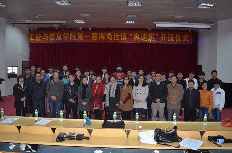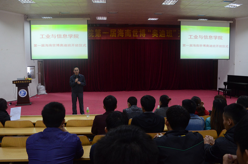 111上午,我校工業(yè)與信息學(xué)院在學(xué)術(shù)報告廳舉行第一屆“海南世博奧迪班”開班儀式。海南世博汽車服務(wù)有限公司董事長助理陳佳、人事部經(jīng)理鄭立鮑,我校教務(wù)長副處長趙中文、王云惠,我校工信學(xué)院領(lǐng)導(dǎo)和汽車專業(yè)部分教師。