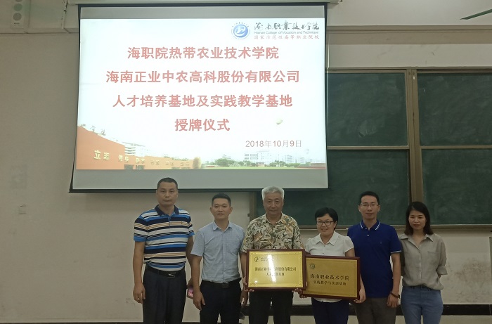 10月9日,我校熱帶農(nóng)業(yè)技術(shù)學(xué)院與海南正業(yè)中農(nóng)高科股份有限公司舉行人才培養(yǎng)基地及實(shí)踐教學(xué)基地授牌儀式。海南正業(yè)中農(nóng)高科股份有限公司總經(jīng)理兼人力資源總監(jiān)張偉、學(xué)院院長(zhǎng)林向東出席授牌儀式。學(xué)院黨總支書記吳多清主持儀式。