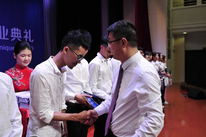 畢業(yè)典禮在雄壯的國(guó)歌聲中拉開序幕。李琳娜、符興干分別宣讀《關(guān)于批準(zhǔn)2019屆畢業(yè)生畢業(yè)的決定》、《關(guān)于表彰2019屆優(yōu)秀畢業(yè)生的決定》。隨后,王安興為畢業(yè)生代表頒發(fā)畢業(yè)證書和畢業(yè)紀(jì)念品,周炳才為優(yōu)秀畢業(yè)生代表頒發(fā)榮譽(yù)證書。