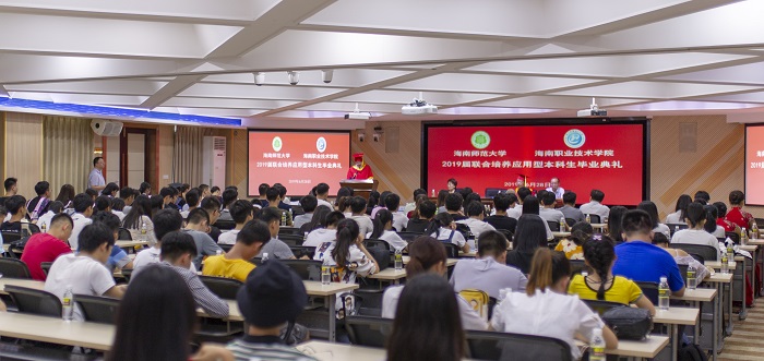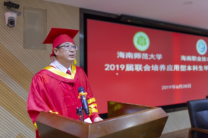 6月28日,由我校、海南師范大學(xué)聯(lián)合舉辦的2019屆聯(lián)合培養(yǎng)應(yīng)用型本科生畢業(yè)典禮在學(xué)校圖書館六樓第一會議室舉行。海南師范大學(xué)校長林強(qiáng)、海南職業(yè)技術(shù)學(xué)院校長王安興、海南師范大學(xué)教務(wù)處處長梁廣、海南職業(yè)技術(shù)學(xué)院校長助理李琳娜出席典禮。典禮由海南職業(yè)技術(shù)學(xué)院教務(wù)處副處長沈振國主持。