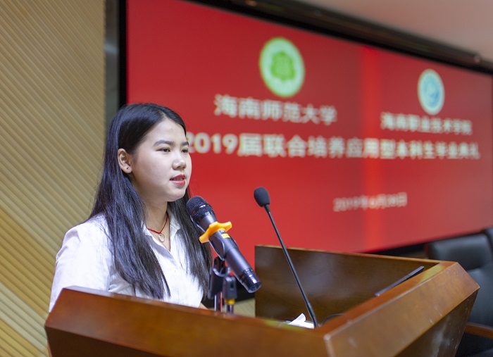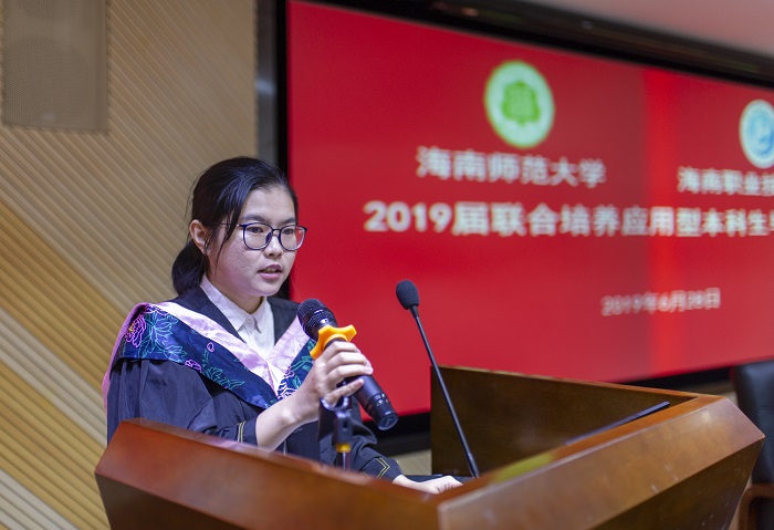 畢業(yè)生代表吳彩瑜在發(fā)言中追憶了大學(xué)四年美好難忘的生活,表達(dá)了對海職院海師兩所母校的感恩。她說,我們承載著海職院和海師兩所母校的殷切期望和深情囑托,無論我們今后是走上了工作崗位,還是繼續(xù)深造,我們都將以最飽滿的熱情勇敢地面各種挑戰(zhàn),堅(jiān)定不移地朝著美好的未來努力前進(jìn)。