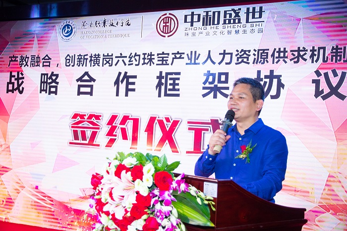 陳火龍在講話中表示,校企聯(lián)合建立“人才共育、資源共享、優(yōu)勢互補、協(xié)同發(fā)展”的產(chǎn)教融合全新模式,可以更好地發(fā)揮學校的科研優(yōu)勢、人才優(yōu)勢及企業(yè)的資源優(yōu)勢、市場優(yōu)勢。校企雙方將深入挖掘合作潛力,不斷提高合作層次,擴大合作范圍,為合作的深入和鞏固創(chuàng)造良好的條件,共同致力于打造橫崗六約珠寶產(chǎn)業(yè)工匠的“黃埔軍校”。