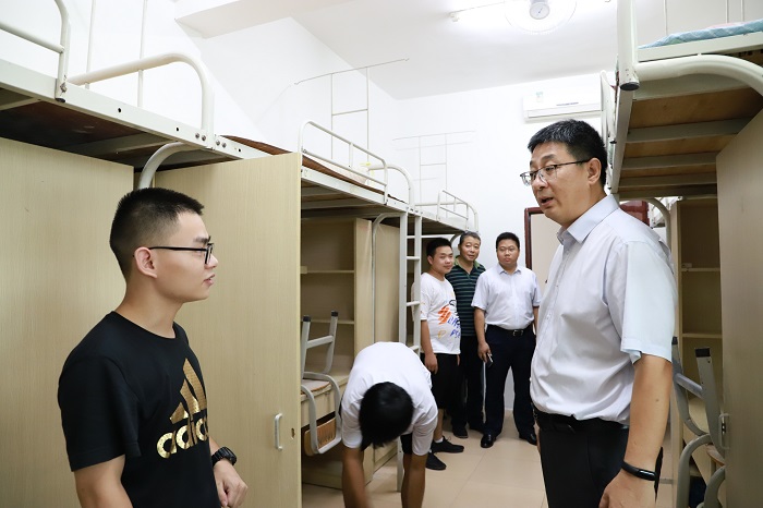王安興、王承慶來(lái)到新生宿舍,檢查房間中的柜子、桌椅、空調(diào)等物品是否能正常使用,走到衛(wèi)生間查看衛(wèi)生情況。與新生交談時(shí),得知有的新生來(lái)自四川、云南、江西等不同地方的時(shí)候,關(guān)心地詢問(wèn)他們是否適應(yīng)海南的環(huán)境,飲食方面是否習(xí)慣,并囑咐他們,海南天氣炎熱,要注意防暑要多喝水。
