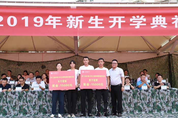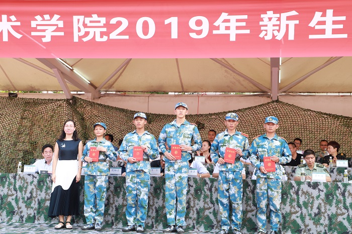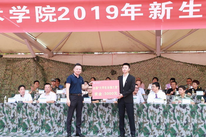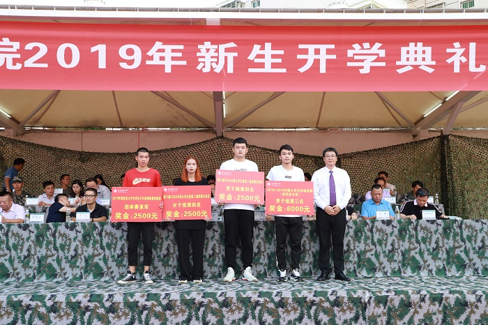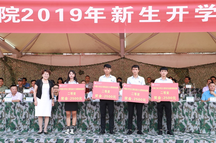 王承慶向承訓(xùn)部隊(duì)贈(zèng)送錦旗。黨委副書記周炳才宣讀學(xué)校表彰新生獎(jiǎng)學(xué)金、2019年上半年學(xué)生文化、藝術(shù)、體育和技能大賽獲獎(jiǎng)團(tuán)隊(duì)和個(gè)人及2019級(jí)新生軍訓(xùn)先進(jìn)集體及優(yōu)秀個(gè)人的表彰決定的文件。隨后,主席臺(tái)就坐領(lǐng)導(dǎo)為獲獎(jiǎng)?wù)哳C獎(jiǎng)。