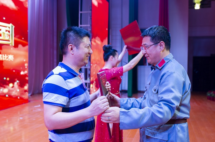 周炳才為大合唱比賽三等獎(jiǎng)獲獎(jiǎng)單位頒獎(jiǎng)(圖書館 梁平攝影)