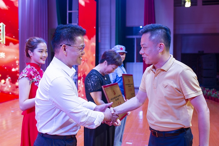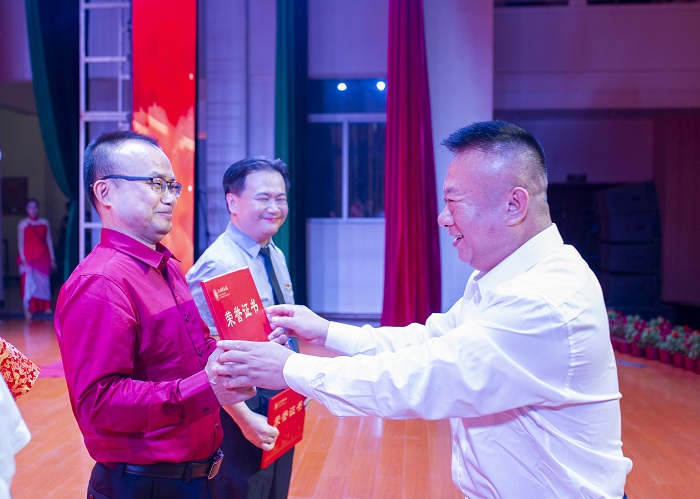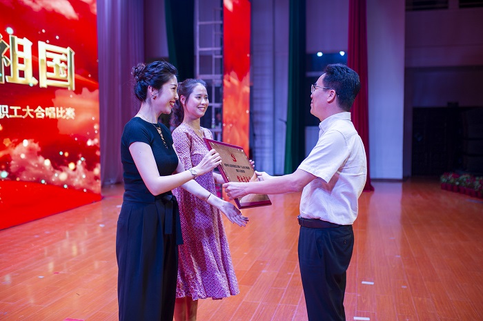 林方賀為大合唱比賽優(yōu)秀獎(jiǎng)獲獎(jiǎng)單位頒獎(jiǎng)(圖書館 梁平攝影)
