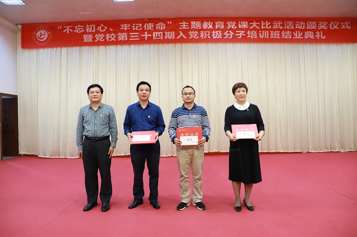 張奕宣讀“不忘初心、牢記使命”主題教育黨課大比武評比結果通報及黨校第三十四期入黨積極分子培訓班結業(yè)文件。周炳才為入黨積極分子培訓班結業(yè)學員代表頒發(fā)結業(yè)證書。王承慶為“不忘初心、牢記使命”主題教育黨課大比武獲獎者頒發(fā)證書及獎金。