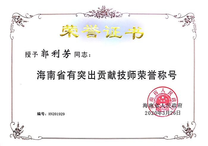 郭利芳榮獲“海南省有突出貢獻(xiàn)技師”榮譽(yù)稱號(旅游學(xué)院供圖)