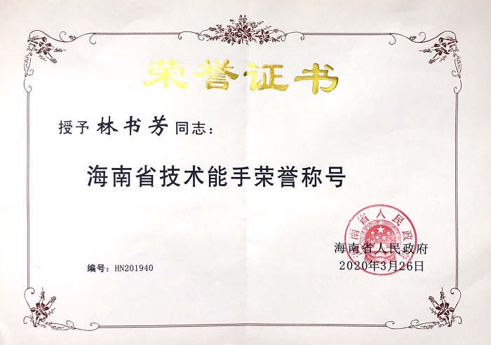林書芳榮獲“海南省技術(shù)能手”榮譽(yù)稱號(旅游學(xué)院供圖)