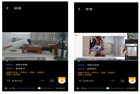 結合國家疫情防控對體育課程的指導意見,優(yōu)先安排理論知識培訓,從身體素質鍛煉的重要性到居家鍛煉的注意事項、運動損傷的預防與應急處置等方面進行講解,得到學生的一致好評。每一次線上體育課學生到課率高達90%以上,學生課堂互動交流點贊達1萬3千多次,課堂結束后依然在線長達1小時。