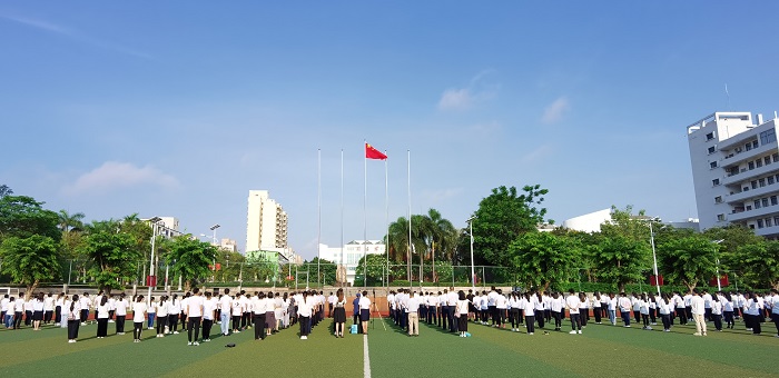 早上8時,在莊嚴的國歌聲中,學校黨政領導和師生代表在學校運動場同升國旗、同唱國歌、向國旗敬禮,講述中國戰(zhàn)“疫”故事,共同表達對偉大祖國的祝福。各班同學在教室通過直播觀看升旗儀式。