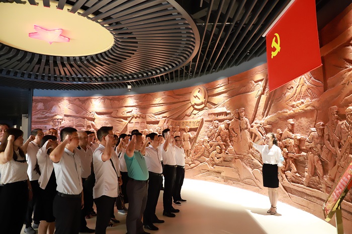 在“紅旗不倒”展廳,全體黨員一同重溫那段令人熱血沸騰的光輝歲月。隨后,在黨委辦公室副主任張奕的帶領(lǐng)下,全體黨員面向黨旗,莊嚴(yán)宣誓,聲音鏗鏘、神情莊重地許下對黨和人民的承諾。
