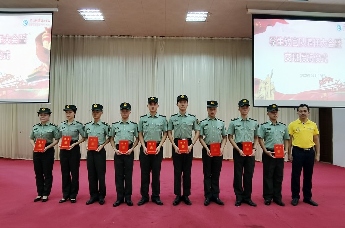7月19日,我校在學術(shù)報告廳舉行學生教官隊聘任大會暨交班授旗儀式。學校黨委委員、校長助理符興干出席并講話,學生工作處副處長鐘清云主持儀式。
