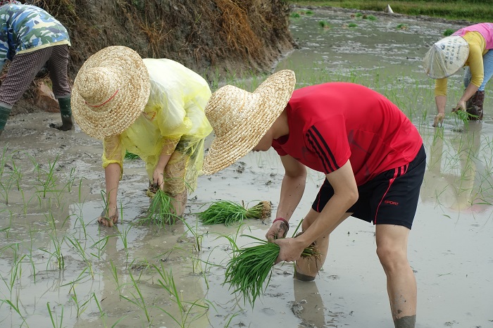 綠光生態(tài)旅游志愿服務(wù)隊(duì)在梯田插秧(旅游學(xué)院供圖)