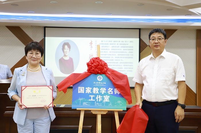 王安興為國(guó)家教學(xué)名師工作室主持人李琳娜頒發(fā)聘書(shū)并授牌(黨委宣傳部供圖)