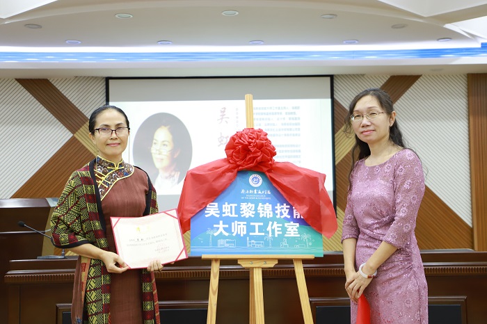 黃銀珍為吳虹黎錦技能大師工作室主持人吳虹頒發(fā)聘書(shū)并授牌(黨委宣傳部供圖)