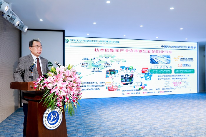 韓傳峰作《中國職業(yè)教育的時(shí)代新命題》專題演講(黨委宣傳部供圖)