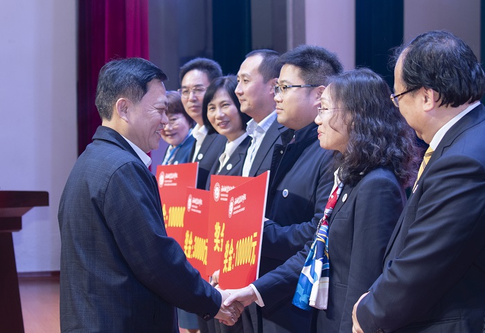 黨委書(shū)記王承慶為2020年在各級(jí)各類(lèi)比賽中獲獎(jiǎng)教職工集體與個(gè)人代表頒獎(jiǎng)(黨委宣傳部供圖)