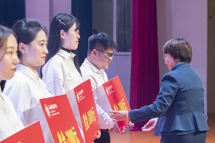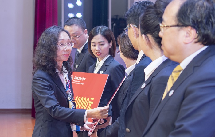 副校長(zhǎng)黃銀珍為2020年學(xué)校創(chuàng)收及社會(huì)服務(wù)貢獻(xiàn)先進(jìn)集體代表頒獎(jiǎng)(黨委宣傳部供圖)