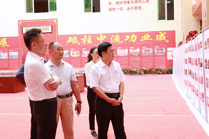海南科技職業(yè)大學(xué)黨委副書記郭萬洲(中)陪同我校黨委書記王承慶、黨委副書記周炳才參觀黨史學(xué)習(xí)教育展覽(黨委宣傳部供圖)