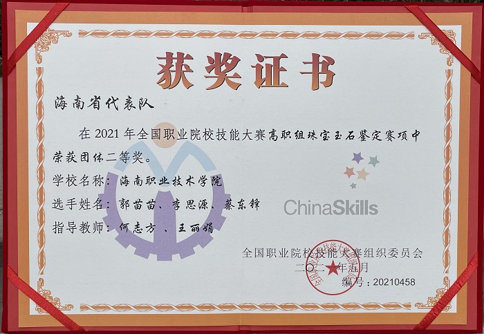 6月16日至17日,2021年全國職業(yè)院校技能大賽高職組珠寶玉石鑒定賽項在蘭州資源環(huán)境職業(yè)技術(shù)學院成功舉辦,海職學子代表海南省參賽,榮獲該賽項團體賽二等獎。