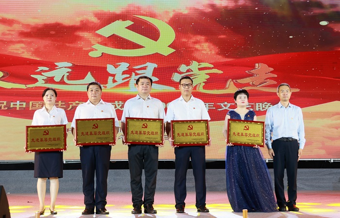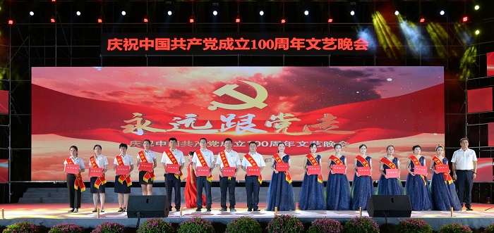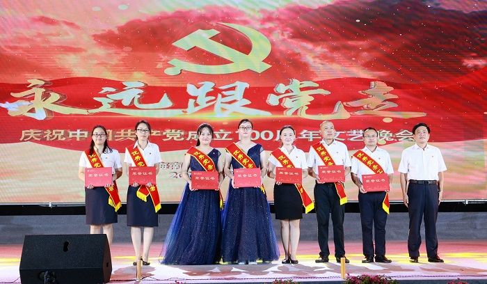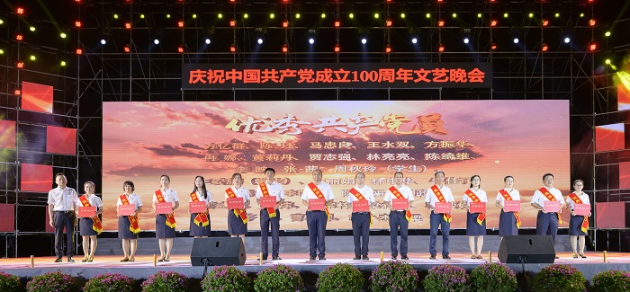 晚會開場前,對榮獲2021年學校“優(yōu)秀共產黨員”“優(yōu)秀黨務工作者”“先進基層黨組織”稱號的黨員和基層黨組織進行表彰。莫泉平、王承慶、王安興、周炳才分別為榮獲“先進基層黨組織”“優(yōu)秀黨務工作者”“優(yōu)秀共產黨員”稱號的基層黨組織代表、黨務工作者和黨員頒獎。