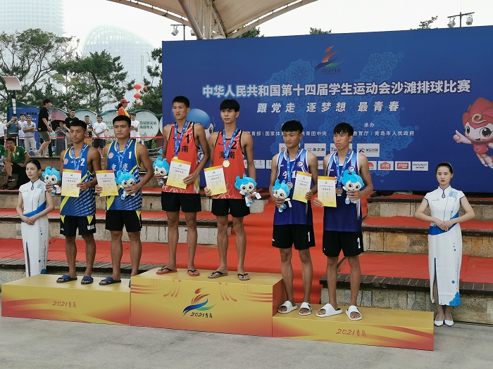 7月12日,中華人民共和國(guó)第十四屆學(xué)生運(yùn)動(dòng)會(huì)沙灘排球比賽在山東青島落下帷幕,由我校隊(duì)員鄺必凱同學(xué)和海南師范大學(xué)隊(duì)員王善翡同學(xué)組成的海南省大學(xué)生沙灘排球代表隊(duì),一路過關(guān)斬將,奪得比賽冠軍。