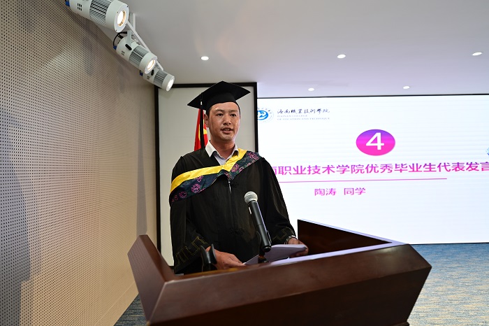 陶濤作為海南職業(yè)技術(shù)學(xué)院優(yōu)秀畢業(yè)生代表發(fā)言(繼續(xù)教育學(xué)院供圖)