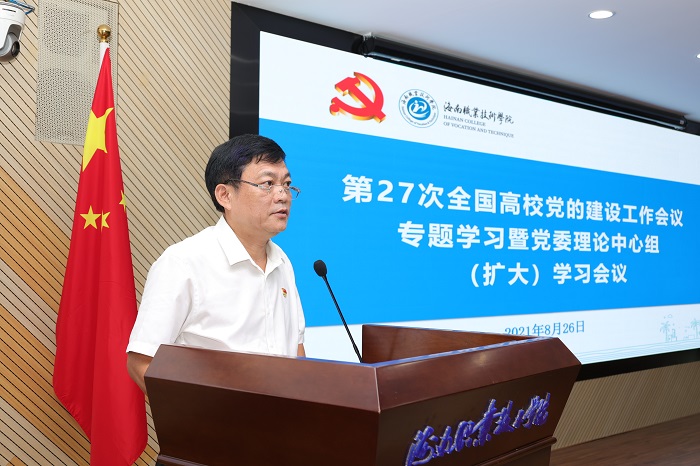 8月26日上午,海南職業(yè)技術(shù)學(xué)院召開黨委理論學(xué)習(xí)中心組(擴(kuò)大)學(xué)習(xí)會,專題學(xué)習(xí)第27次全國高校黨的建設(shè)工作會議精神。校黨委書記王承慶主持會議并講話。代校長黃銀珍,黨委副書記周炳才,副校長康霖,黨委委員、副校長符興干,副校長李琳娜出席會議。