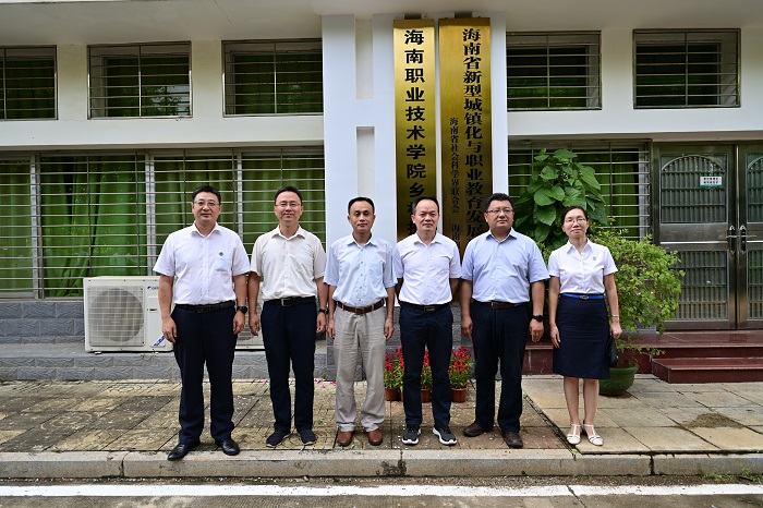 (“海南職業(yè)技術(shù)學(xué)院鄉(xiāng)村振興學(xué)院”揭牌儀式。左起:海南職業(yè)技術(shù)學(xué)院黨委副書記、鄉(xiāng)村振興學(xué)院院長王安興,海南省教育廳高等教育處處長王飛,中共海南省委組織部黨員教育中心主任吳堅(jiān),海南省農(nóng)業(yè)廳人事處處長王光福,海南省鄉(xiāng)村振興局社會扶貧處處長陰若珂,海南職業(yè)技術(shù)學(xué)院代校長黃銀珍  黨委宣傳部供圖)