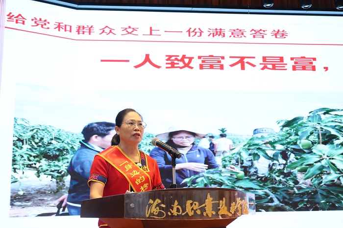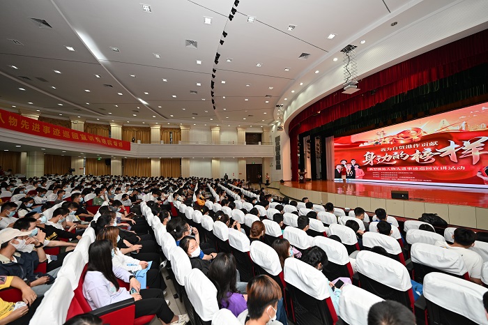 報告團成員分別向我校師生講述了“七一勛章”獲得者、“全國勞動模范”、瓊海市潭門鎮(zhèn)黨支部書記王書茂,全國優(yōu)秀共產(chǎn)黨員、??谑信潘O(shè)施事務(wù)中心秀英大隊副大隊長陳清琪,全國優(yōu)秀共產(chǎn)黨員、海南航空飛行教員李雪峰,全國優(yōu)秀共產(chǎn)黨員、海南農(nóng)墾烏石白馬嶺茶業(yè)有限公司技術(shù)員符小琴,全國優(yōu)秀共產(chǎn)黨員、全國抗擊新冠肺炎疫情先進個人、三亞市人民醫(yī)院呼吸內(nèi)科副主任王彬,全國優(yōu)秀黨務(wù)工作者、陵水縣文羅鎮(zhèn)五星村黨總支書記、村主任黃麗萍,全國先進基層黨組織負責人、海口市秀英區(qū)石山鎮(zhèn)施茶村黨委書記、村主任洪義乾,全國先進基層黨組織負責人、三沙市七連嶼工委副書記、管委會主任常曉忠,海南省優(yōu)秀共產(chǎn)黨員、海南省委省政府追記一等功的海南省委外事工作委員會辦公室老干處原處長袁慧斌,海南省優(yōu)秀共產(chǎn)黨員、海南省委省政府追記二等功的海南省紀委案件監(jiān)督管理室三處原處長鄭家寧等10位來自全省多個行業(yè)領(lǐng)域戰(zhàn)線的典型模范人物的優(yōu)秀事跡。講述者聲情并茂,聆聽者感同身受,這些先進模范人物的事跡深深吸引并感染了在場師生,從他們身上,師生們看到了偉大的建黨精神、特區(qū)精神和椰樹精神,看到了共產(chǎn)黨人聽黨話、跟黨走,一心為民、夙夜在公的初心和使命。