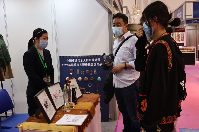 學(xué)校繼續(xù)教育學(xué)院、旅游學(xué)院組織黎族織錦技藝和珠寶設(shè)計(jì)師生聯(lián)合團(tuán)隊(duì)參加此次展會(huì),現(xiàn)場(chǎng)展示了具有海南黎族特色的創(chuàng)意飾品、服飾、包包和茶墊等作品,充分表現(xiàn)了海南本土特色文化。在此次展會(huì)上,黎錦服飾與珠寶作品受到了參會(huì)人群的高度關(guān)注,多家珠寶廠商與黎族織錦技藝和珠寶設(shè)計(jì)師生聯(lián)合團(tuán)隊(duì)達(dá)成合作意向。