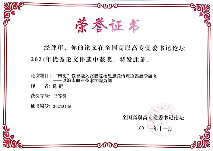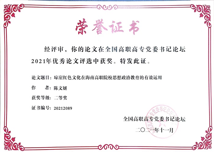 全國(guó)高職高專黨委書記論壇日前公布了2021年論文評(píng)審結(jié)果獲獎(jiǎng)名單,我校思想政治教學(xué)部陳文妍老師撰寫的論文《瓊崖紅色文化在海南高職院校思想政治教育的有效運(yùn)用》獲得二等獎(jiǎng);陳翾老師撰寫的論文《“四史”教育融入高職院校思想政治理論課教學(xué)研究——以海南職業(yè)技術(shù)學(xué)院為例》獲得三等獎(jiǎng)。