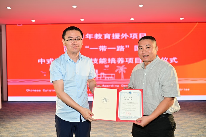 隨后,康霖為授課教師代表、尼泊爾校方代表頒發(fā)證書。據(jù)悉,受新冠疫情影響和出入境政策調(diào)整背景下,學(xué)校啟動線上援外培訓(xùn)、項目。學(xué)校與海南省紀(jì)寬宏技能大師工作室強(qiáng)強(qiáng)聯(lián)手,聘請大師級授課團(tuán)隊,以受援國實際需要為基礎(chǔ),以人才培養(yǎng)為核心,精心制作授課課程包,內(nèi)容包含20道中國傳統(tǒng)菜品加工與制作的完整過程教學(xué)視頻、詳細(xì)烹飪教學(xué)資料等,從菜肴文化、用料搭配到制作過程中刀工的運用、火候的掌握,到最后菜肴的味道、裝盤的美化等各個環(huán)節(jié),都力求做到精益求精、通俗易懂。