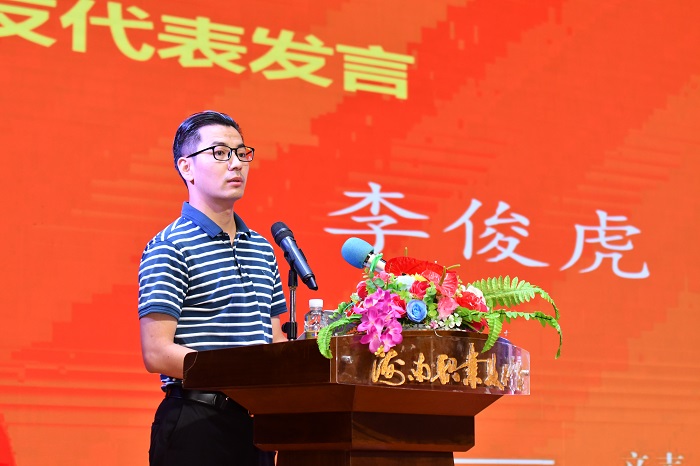 (校友代表李俊虎發(fā)言  黨委宣傳部供圖)
