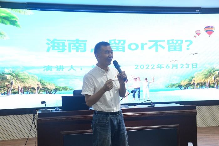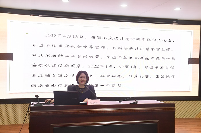 宣講中,袁鵬首先以《習近平總書記在慶祝中國共產(chǎn)主義青年團成立100周年大會上的重要講話精神解讀》作為本次宣講活動的開講內(nèi)容。他通過“八個方面的深刻領(lǐng)會”深入淺出的講解了習近平總書記重要講話精神中蘊含的理論知識、重要觀點和重要要求。丁匡一從走近青年馬克思、習近平總書記總結(jié)馬克思留下的精神財富、新時代青年應(yīng)如何學習馬克思主義來教育青年學子如何《跟著習近平總書記學習馬克思主義》。楊艷紅以習近平總書記的考察海南路線為宣講主線,帶領(lǐng)全體師生感受習近平總書記深厚的人民情懷。劉廣全向?qū)W生拋出“海南,留or不留?”話題,與學生分析海南自貿(mào)港建設(shè)發(fā)展的前景與機遇,共同探討擁有遠大抱負的學生青年應(yīng)該在面臨選擇的時候如何去實現(xiàn)自己的夢想。