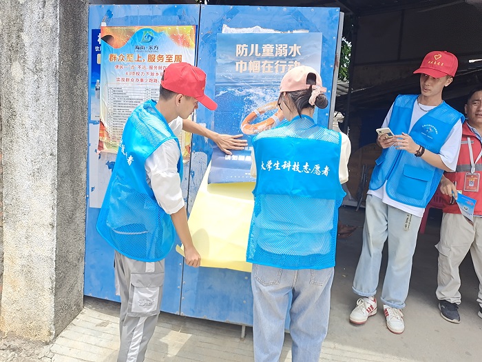 (學生志愿者粘貼防溺水宣傳海報  校團委供圖)