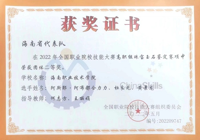 2022年“中銀杯”全國職業(yè)院校技能大賽高職組“珠寶玉石鑒定”賽項于2022年9月6日至9日在甘肅蘭州舉行。旅游學院珠寶首飾技術(shù)與管理專業(yè)杜良元、黃景龍、阿斯耶·阿布都合力力三位同學組成的海南省代表隊,在何志方、王麗娟老師的指導下,沉著應戰(zhàn)、奮力拼搏,憑借扎實的專業(yè)知識技能和良好的職業(yè)素養(yǎng),勇奪團體二等獎。