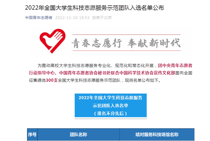 人工智能志愿服務隊此次入選,是今年10月由團中央青年志愿者行動指導中心、中國青年志愿者協(xié)會秘書處聯(lián)合中國科學技術協(xié)會宣傳文化部,按照《中國科協(xié) 教育部 共青團中央 中央文明辦關于聯(lián)合開展高校大學生科技志愿服務工作的通知》精神,面向全國高校遴選300支大學生科技志愿服務示范團隊,旨在推動高校大學生科技志愿服務專業(yè)化、規(guī)范化和常態(tài)化開展。