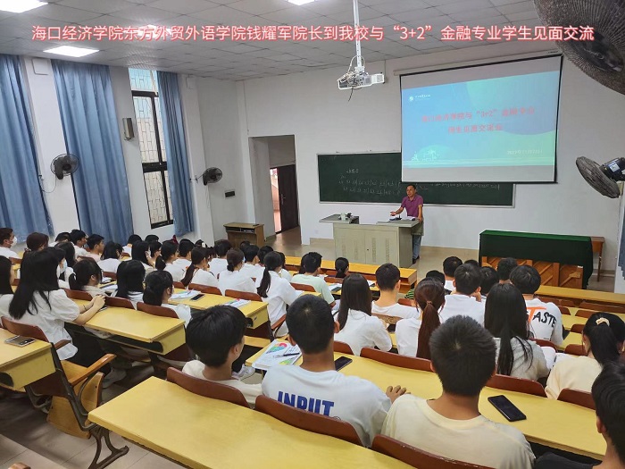 首先,我校經(jīng)濟管理學院教學副院長劉純超帶領海口經(jīng)濟學院錢耀軍院長一行到行政樓101階梯教室與金融服務與管理“3+2”班的學生見面交流。錢耀軍院長向同學們介紹了??诮?jīng)濟學院“3+2”辦學情況、課程設置等,并解答了同學們提出的問題。