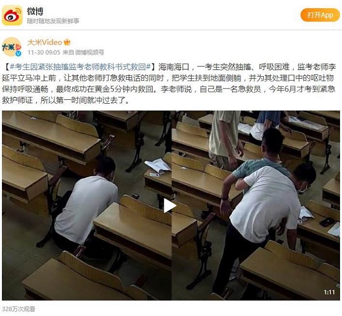 11月20日下午,在海南職業(yè)技術學院舉行的一次《建筑工程》科目考試中,一名來自海南澄邁的考生突然身體不適,監(jiān)考員李延平老師發(fā)現(xiàn)異常后,毫不猶豫地飛奔至這位考生面前進行處置,在這危急時刻,只見他一邊指揮人去叫醫(yī)生,一邊把他搬到了地上,當場采取了有效的急救措施,使該生得到有效保護及救治,目前考生病情平穩(wěn),已無大礙。