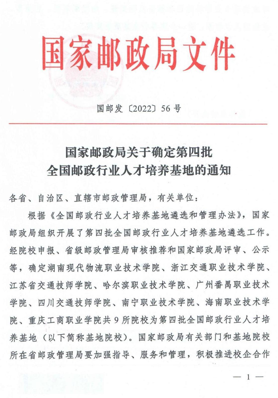 日前,國家郵政局發(fā)布《關于確定第四批全國郵政行業(yè)人才培養(yǎng)基地的通知》,我校被評為第四批全國郵政行業(yè)人才培養(yǎng)基地。