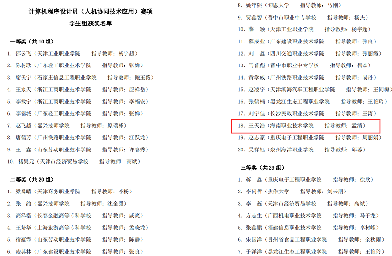 近日,由人力資源社會保障部組織開展的2022年全國行業(yè)職業(yè)技能競賽——全國電子企業(yè)職業(yè)技能競賽(國家二類賽)公布獲獎名單,我校工業(yè)與信息學(xué)院學(xué)生王天浩榮獲計算機(jī)程序設(shè)計員(人機(jī)協(xié)同技術(shù)應(yīng)用)賽項學(xué)生組全國二等獎。
