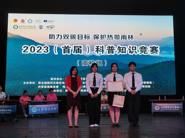 5月22日,由海南省林業(yè)局 (海南熱帶雨林國(guó)家公園管理局 )、共青團(tuán)海南省委、海南省文學(xué)藝術(shù)聯(lián)合會(huì)、五指山市政府、聯(lián)合國(guó)教科文組織 (UNESCO) 駐華代表處、海南國(guó)家公園研究院聯(lián)合主辦的2023年(首屆)“助力雙碳目標(biāo),保護(hù)熱帶雨林”科普知識(shí)競(jìng)賽決賽在海南大學(xué)舉行,經(jīng)過(guò)激烈的角逐,我校代表隊(duì)榮獲高校組三等獎(jiǎng)。